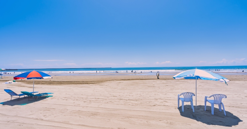 遠浅の海と広い白砂が魅力の人気ビーチ。波が穏やかで初心者でも安心して遊べるため、夏には多くの海水浴客で賑わいます。景色も美しく、夕景スポットとしてもおすすめ。